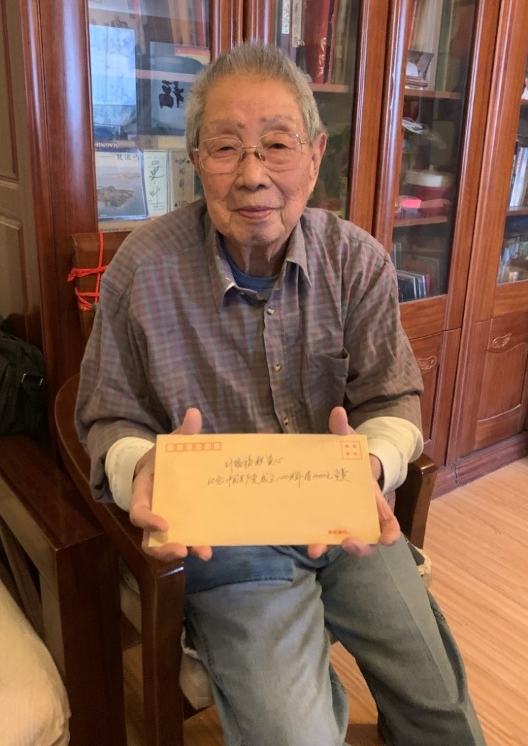 在走訪慰問過程中,黃曉華與葉瑞福親切交談,感謝他幾十年來為集團公司文化宣傳事業(yè)做出的貢獻(xiàn),同時感謝他在2020年向集團捐贈一批多年珍藏的歷史資料。今年89歲的葉瑞福是傷殘退伍軍人,是集團原中演公司宣傳、資料管理方面負(fù)責(zé)人,承擔(dān)演出項目的宣傳及藝術(shù)檔案等工作。慰問過程中,葉瑞福同志拿出早已準(zhǔn)備好的兩個信封交給隨黃書記一同前往的工作人員,一個信封里裝有他本人2021年黨費,另一個信封裝有為慶祝中國共產(chǎn)黨成立100周年繳納的特殊黨費1000元,以表達(dá)對黨的感激之情,向黨獻(xiàn)禮。
